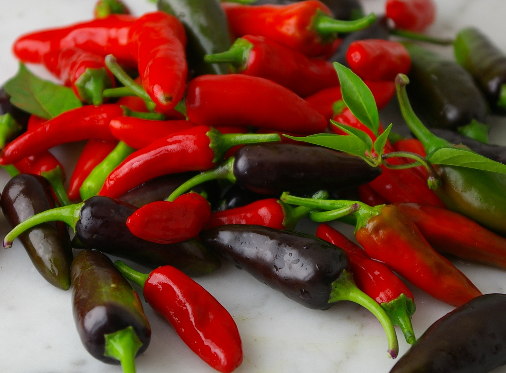 The little chili pepper, packs a punch, so not for the beginner spice-a teer. This recipe makes good use of these pretty little peppers. You can use the pepper of your choice, but for this recipe , I used the little black Hungarian ones, and the firey red hot chili peppers. To calm the beast down , I added a good helping of tomatillos from the garden , and a sweet red pepper .